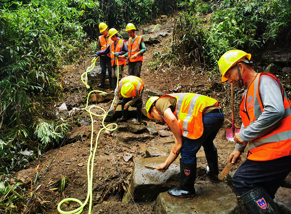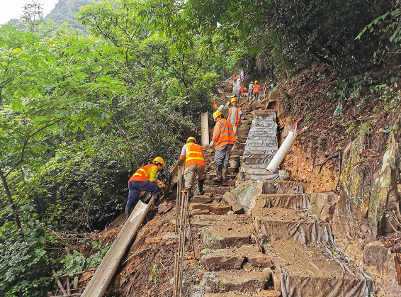 ¹¤ÈËÒÂןñÖØµÄÓêÒ¡¢ÓêÑ¥ £¬Å¿ÔÚÏÕÒªµÄɽµÀÉÏÊ©¹¤ £¬ÌìÌìÒ»ÉíÄà¡¢Ò»ÉíÍÁ¡¢Ò»Éíº¹¡£Í¨Ë×ÈËÅÀÒ»ÌËÒªÒ»¸ö°ëСʱµÄɽ· £¬ÓеŤÈËÒ»ÌìÒªÍù·µÅÀÉÏÎåÁùÌË¡£Îª°ü¹ÜÇå¾² £¬ÔÚÊ©¹¤Ç° £¬¹¥¼áС×éÏÈ´øÈ˽«Ê¯°å·ËùÓÐË¢ÁËÒ»±é £¬ÒÔïÔÌ­»¬µ¹ £¬ºóÓÖÔÚÓÐÌõ¼þµÄµØ·½´îÆðÁËÓêÅï¡£